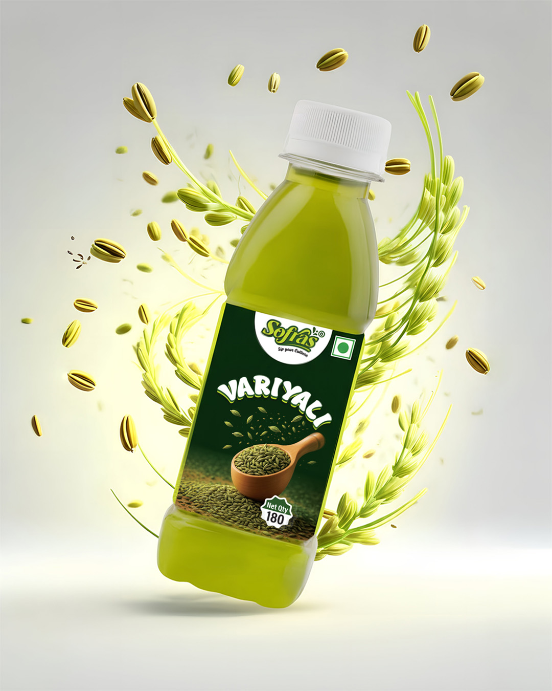 Variyali Zest is a refreshing fennel-flavored soft drink with a hint of sweetness, perfect chilled, over ice, or mixed.